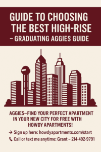 Graduating from Texas A&M and moving into your first big-city apartment is one of the most exciting transitions of your life. And for many new Aggie grads heading to Dallas, Houston, Austin, or San Antonio, nothing says “new chapter” quite like living in a beautiful high-rise apartment. The views, the amenities, the walkability, the city energy—it all creates a lifestyle that feels polished, elevated, and perfectly aligned with your next stage in life.