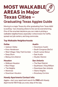 Moving to a major Texas city after graduating from Texas A&M is exciting—but choosing where to live can be overwhelming. One of the smartest decisions you can make is picking a walkable neighborhood, especially in cities known for traffic, spread-out job centers, and long commutes.